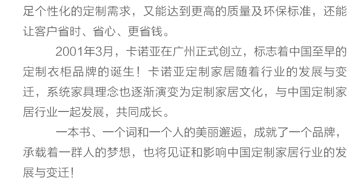 卡諾亞創(chuàng)立于2001年,是集研發(fā)、設(shè)計(jì)、生產(chǎn)和服務(wù)于一體的高新技術(shù)企業(yè)。旗下?lián)碛芯幽Х秸b、卡諾亞高端定制、羅亞全屋定制三大品牌。