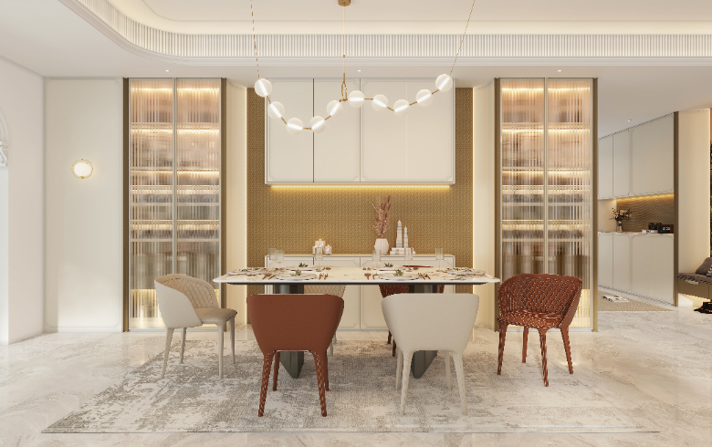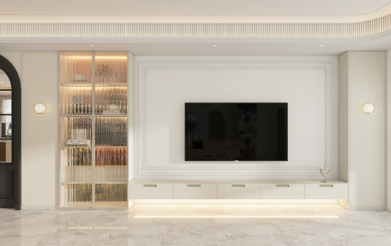 簡單的線條,勾勒出多維空間的變化,目光所及皆是溫柔。餐邊柜呼應入戶柜,大體色調統一,這樣即使入住后小物件較多,也不會顯得凌亂。超大中空,放置各種小家電和飾品完全沒有問題。