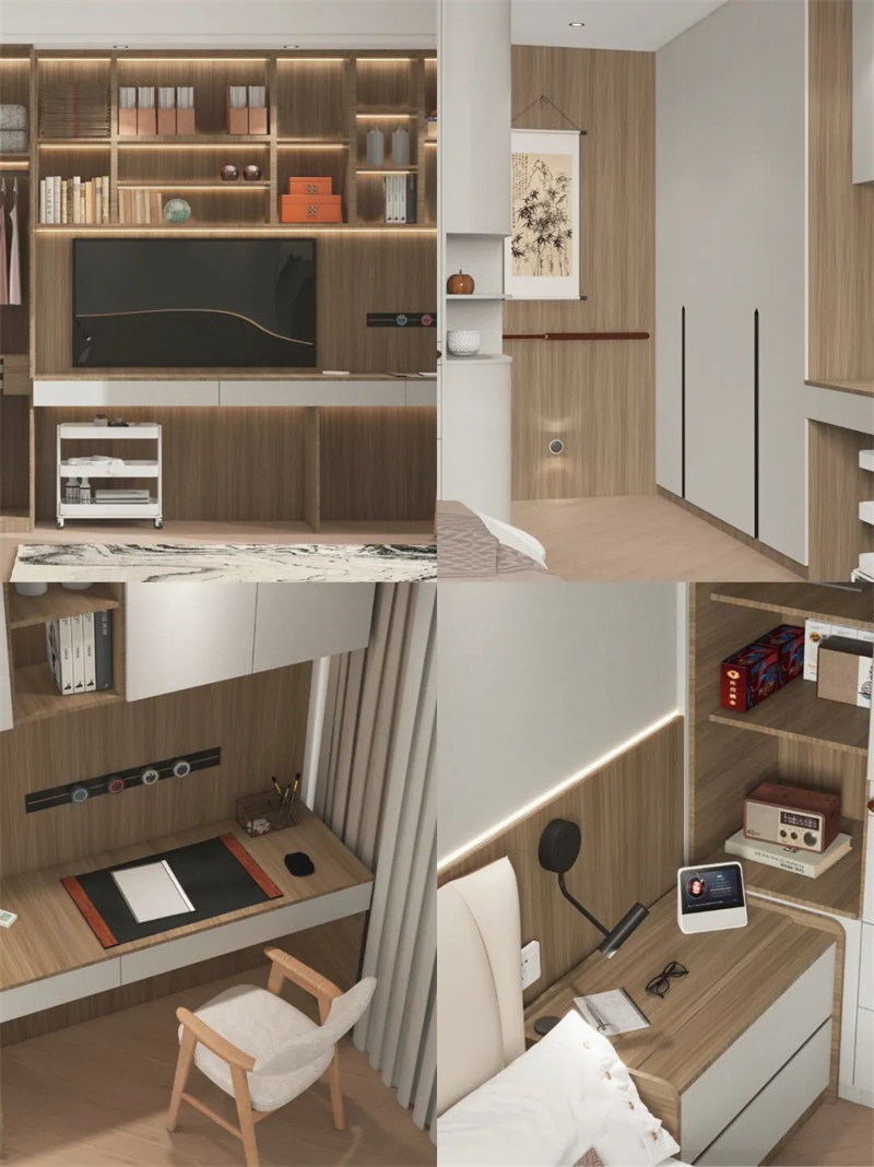 ??床尾選擇做衣柜+書桌柜一體化設計,看書、練書法、看電視,在家悠閑樂享時光?