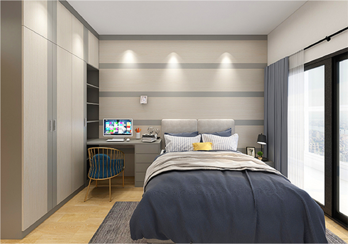 臥室有一個超大肚量的衣柜,高度直接到頂,寬度占據一整面墻,衣柜+書桌書柜一體設計,收納衣物、寫字看書學習都有了。