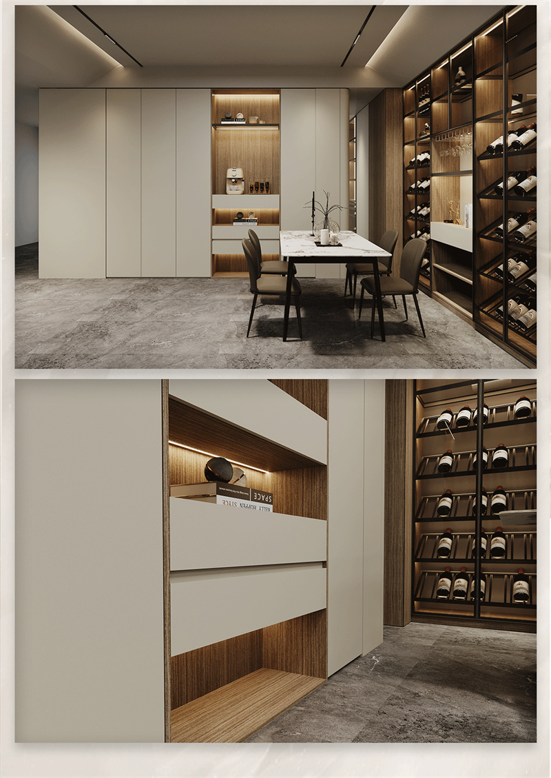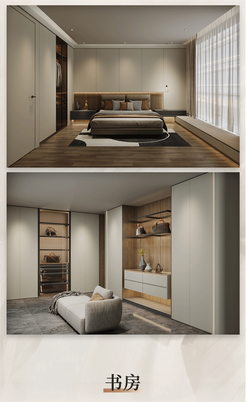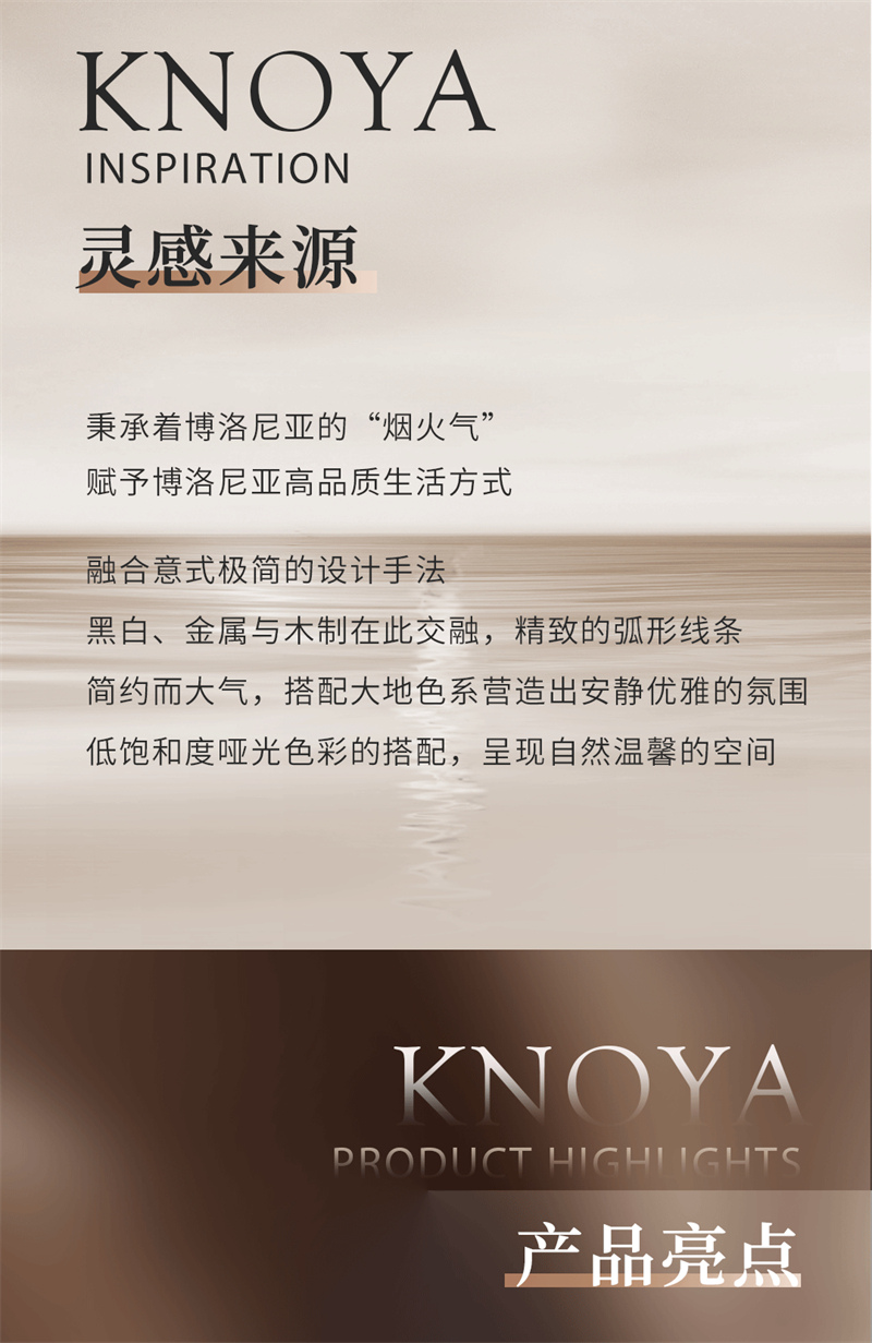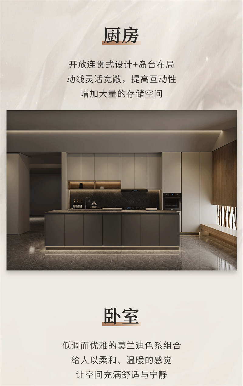 融合意式極簡的設(shè)計(jì)手法,黑白、金屬與木制在此交融,精致的弧形線條簡約而大氣,搭配大地色系營造出安靜優(yōu)雅的氛圍,低飽和度啞光色彩的搭配,呈現(xiàn)自然溫馨的空間。
