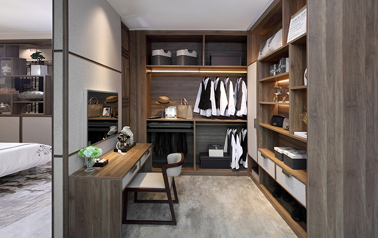 設計上順應趨勢,去掉多余的衣物掛放區,增加擺放展示區,凸顯衣帽間的實用功能。兼顧功能與美學的設計宗旨,實現書房、衣帽間、化妝間三合一功能空間。