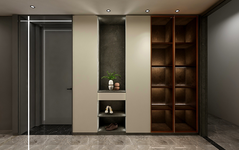 靜謐灰色系,營造安靜的睡眠環(huán)境。“霧光灰”護墻板百變紋理,點綴亮色掛畫,為灰色空間注入活力。長條形懸空柜可化妝可學(xué)習(xí)可收納,將空間裝飾的修長而雋永。