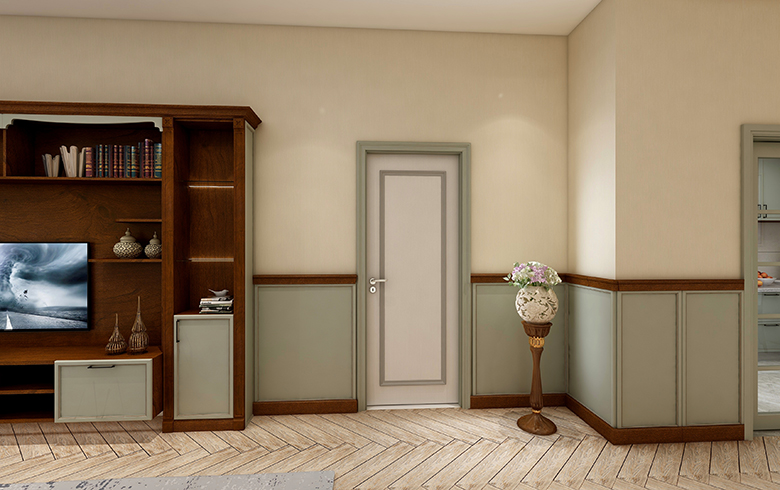 免漆門以白色為空間主色調,輔以灰色立體框線點綴,讓木門的視覺帶有簡歐的風情。