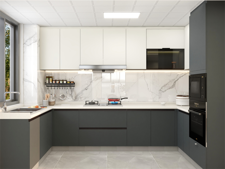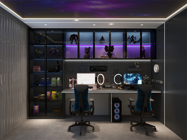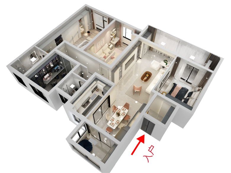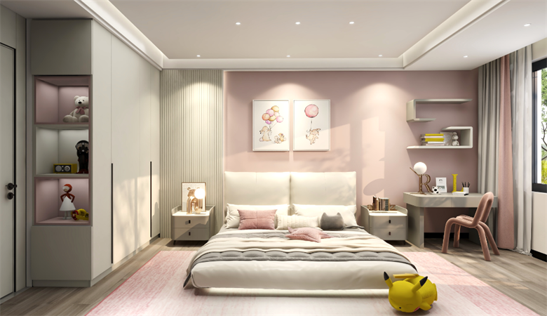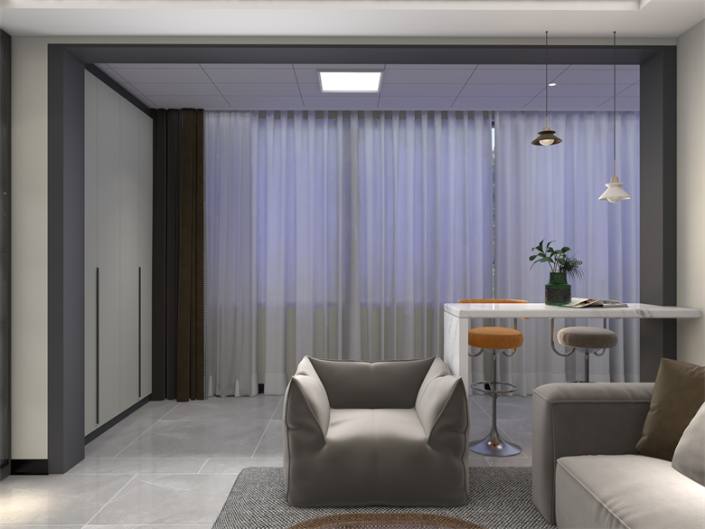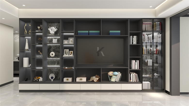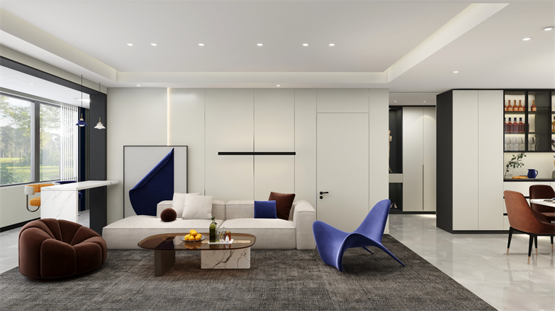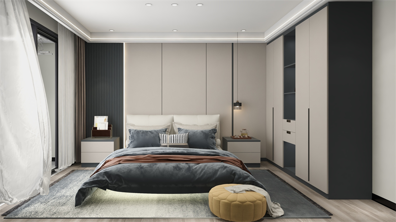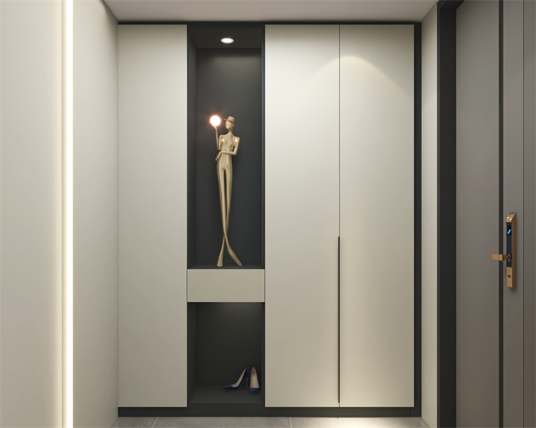 整體風格為現代簡約風。整個空間做到了柜墻門一體化,色系統一協調。柜體柜門運用了澀黑,澀感白兩個顏色。軟裝上冷暖色調隨意搭配。材料上整個采用了糠醛板,環保、堅固還防潮。家里老人小孩都不用擔心。收納區域也是足夠多,做到了美觀且實用。