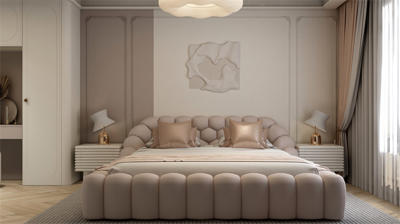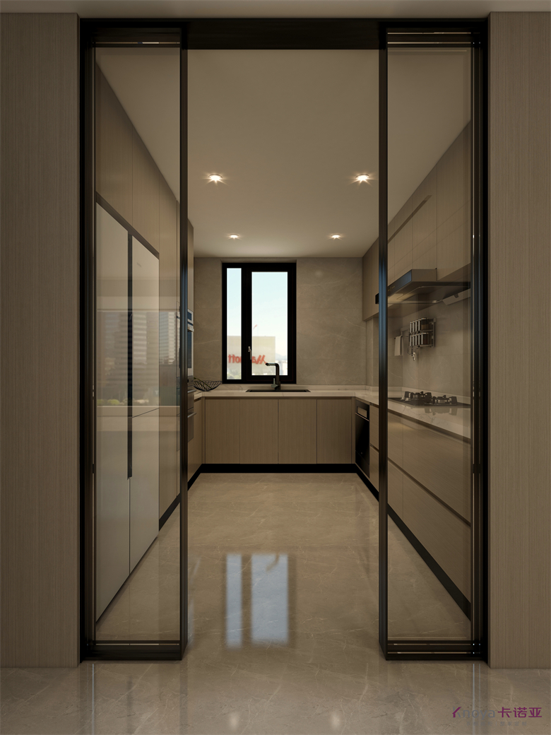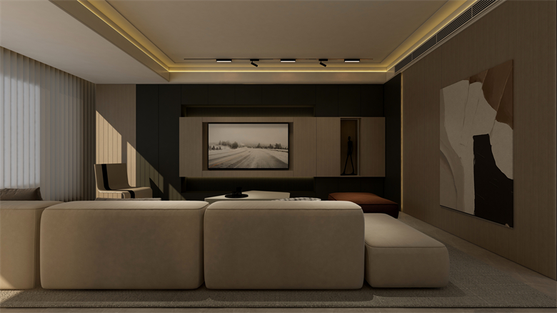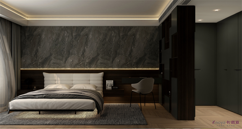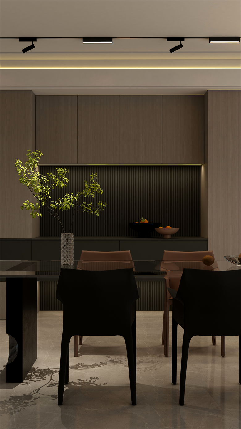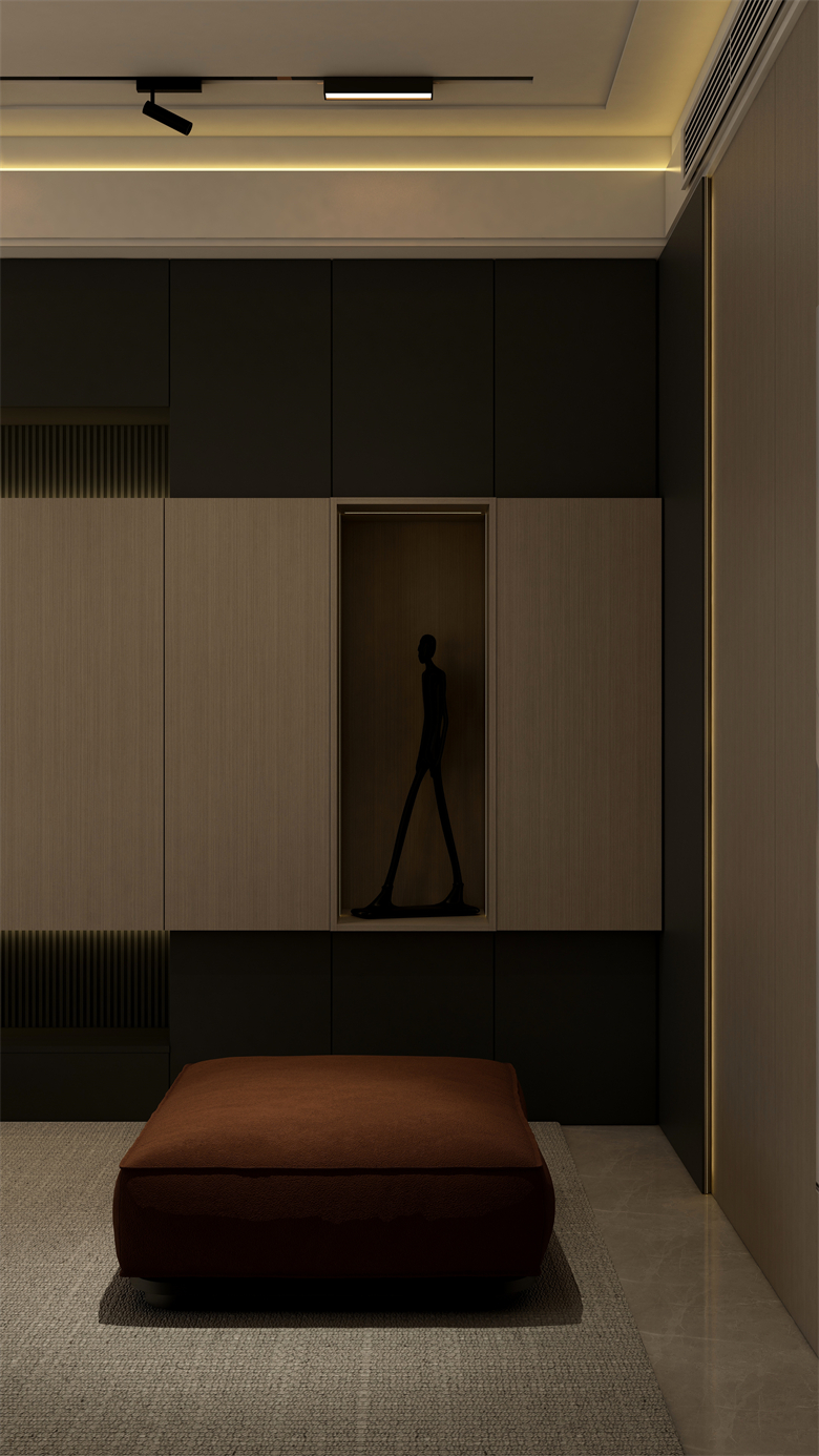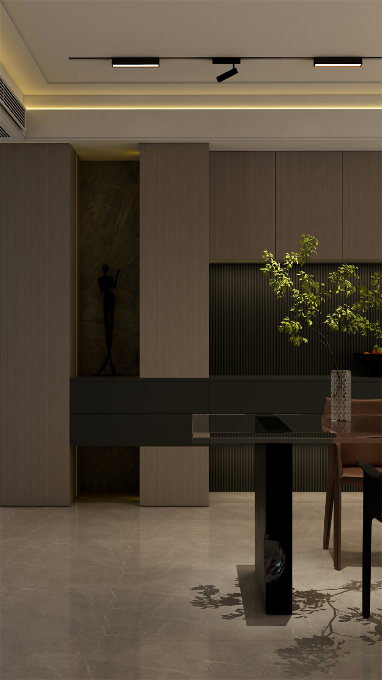 本案設計圍繞業主意式極簡風格的需求,主色調黑、白、灰、咖,多利用金屬色、木色、石材做出變化,點綴少量艷麗色。柜墻門一體化,采用穿插、進退等設計手法,配合燈光使空間簡潔又頗具設計美感。意式極簡風格刪繁就簡,遠離一切浮華和不實用,從生活本質出發,以極簡的設計演繹出最本質的輕奢美學。