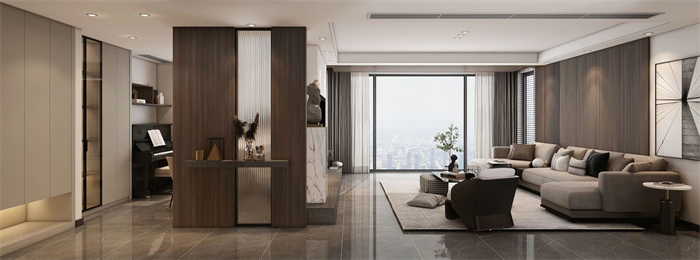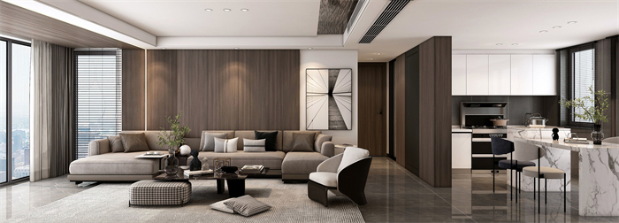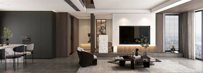 作品簡介:本作原布局是標準小四房,入戶小房間改為交互式客餐廳一體,使得整個空間更加開放通透。出發點為表現出整個空間的連貫性和交互性。全案使用了色塊面積較大的“棕絲木”。木紋細膩舒暢,結合卡諾亞專屬專利扣線,無膠安裝,海棠角完美細節呈現。整體深色木紋系作為主線,純色塊漆面材質作為點綴,小比例藝術玻璃等;各材質協調使用。