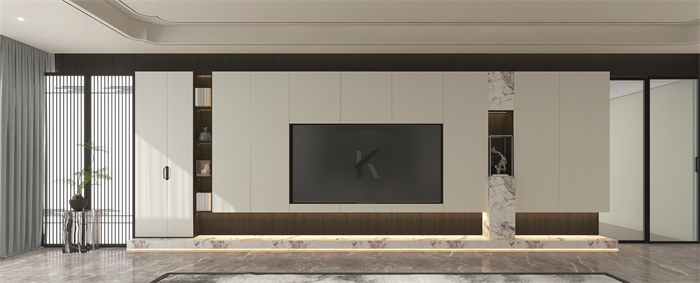 電視柜以環(huán)保水性漆“雅杏”淺色為主,構(gòu)筑素雅基調(diào),水墨石紋、古樸木紋、格柵屏風(fēng)加持,濃濃的東方韻味。
