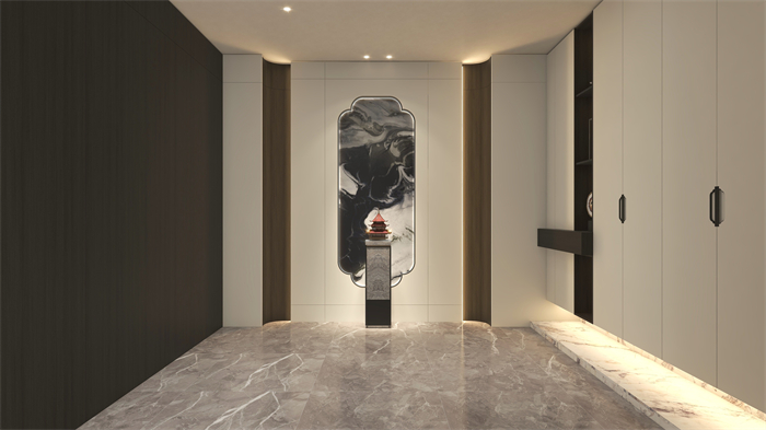 門廳:新中式元素“奢石”地臺(tái)作為點(diǎn)綴,開啟新國潮視覺盛宴。護(hù)墻板燈帶勾勒出簡約的宮燈形狀,與右邊柜門的燈籠造型拉手遙相呼應(yīng)。對稱式圓弧轉(zhuǎn)角,將護(hù)墻板與玄關(guān)柜柔美連接,渾然一體,自然天成。