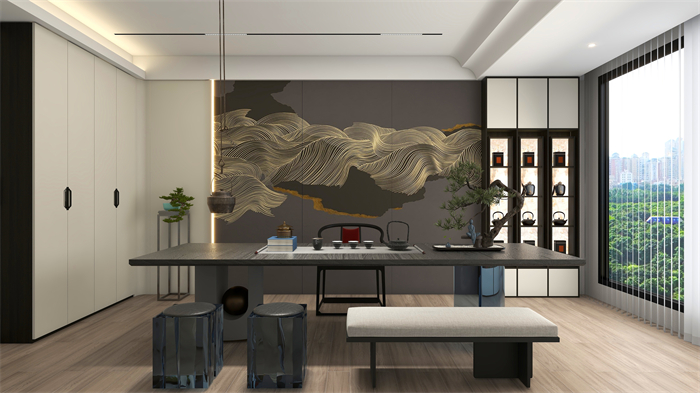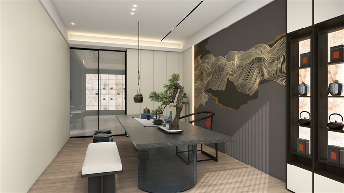 茶室:打破傳統(tǒng)對稱均衡,一側(cè)一門到頂封閉柜,一側(cè)半開放式設(shè)計(jì),既彰顯東方韻味,又為視覺做減法,簡單大雅。玻璃的通透與木紋的肌理相互交融,剛?cè)嵯酀?jì),精致而高級(jí)。