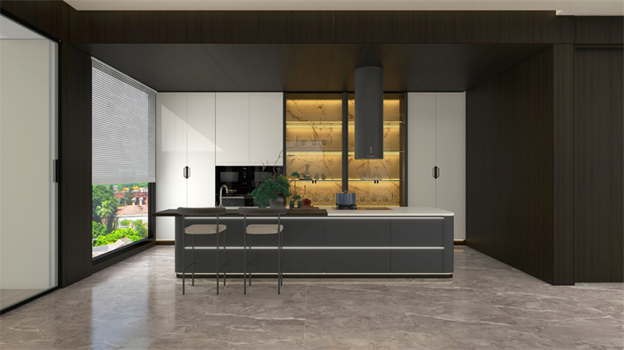 廚房:廚房結(jié)合現(xiàn)代生活需求,以小吧臺(tái)+開放西廚的形式呈現(xiàn),一字形島臺(tái)延伸出洗切煮及餐桌多重功能,散發(fā)著清透高級(jí)的雅致;櫥柜+餐酒柜合二為一,琳瑯滿目的酒水、餐具陳列于金屬玻璃柜中,給人以唾手可得的滿足感。
