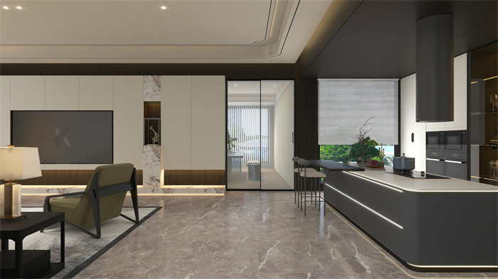 餐廳:餐廚一體化設(shè)計(jì),縮短用餐動(dòng)線,增加交互性,更符合當(dāng)代人的需求。島臺(tái)、吧臺(tái)與餐桌融為一體省空間,圓弧轉(zhuǎn)角營造東方人居的溫潤感,鋪陳優(yōu)雅、低調(diào)、現(xiàn)代、隨性的餐廳氛圍。