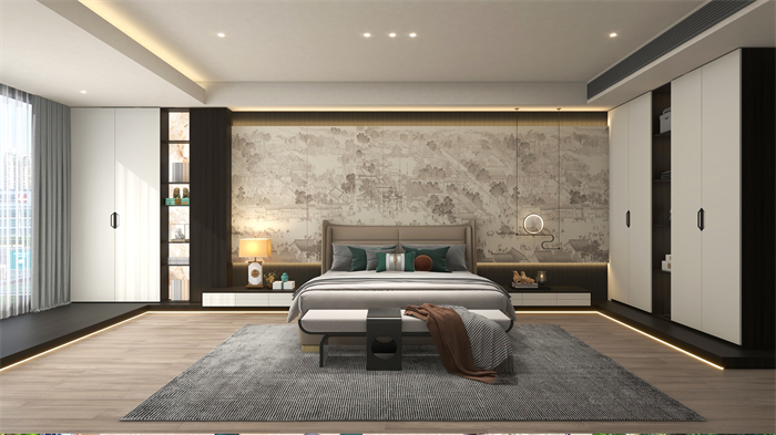 主臥:衣柜及床頭柜采用對稱式設(shè)計(jì),與圓形燈裝飾掛件形成了方與圓的空間禮序,多處鏤空設(shè)計(jì)展示朦朧透視的詩意想象。床尾凳實(shí)用與顏值兼?zhèn)洌┑囊路梢苑旁谶@里,還可充當(dāng)早餐椅,就著陽光,吃著早餐。深色U型地臺(tái)將淺色柜體抬起,收納與顏值兼?zhèn)洌?D錯(cuò)落增加懸浮感,搭配古風(fēng)市井畫,夢回千年古都。