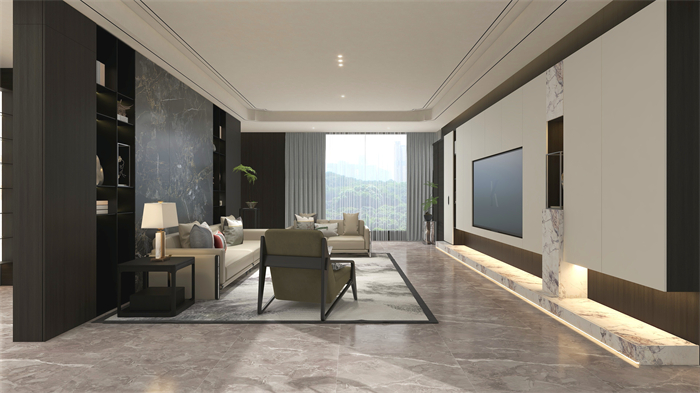 沙發(fā)背景啞黑鋁板柜對稱設(shè)計(jì),與深色“沉香”完美契合,遇見東方禮序之美,木紋、石紋、鋁板,傳統(tǒng)與現(xiàn)代材質(zhì)碰撞彰顯層次感,搭配國風(fēng)家品,更顯東方意境。