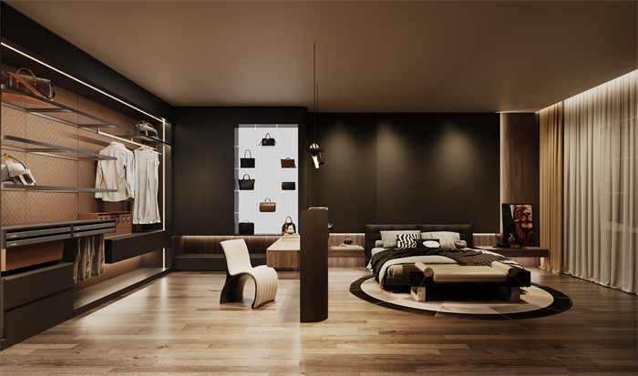逐夢系列設計靈感上,源于當代精英女性對精致生活的追求,代表著公司白領“忙在臥室”的優雅和獨立。設計手法上,整個臥室空間按一體化多功能打造,滿足辦公、休息、放松、娛樂的需求。