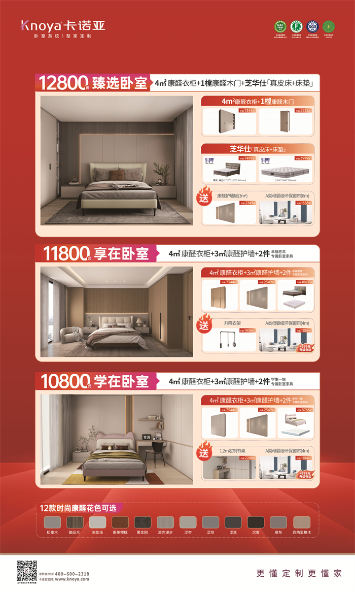 五一大促,卡諾亞力推12800元臻選臥室套餐,以及針對(duì)幸福老年的11800元享在臥室套餐、學(xué)生一族的10800元學(xué)在臥室套餐,不僅實(shí)現(xiàn)消費(fèi)者一站式購齊,還為其帶來更多的便利和千人千面的個(gè)性化解決方案。3大套餐均包含4㎡康醛衣柜,可選十余款時(shí)尚個(gè)性的飾面花色,還有3㎡康醛護(hù)墻板、1樘康醛木門、2件專屬臥室家具、芝華仕大牌真皮床+床墊,驚喜獲贈(zèng)6米或4米A類母嬰級(jí)環(huán)保窗簾、1.2米定制書桌、升降衣架等,套餐明細(xì)請(qǐng)親臨門店咨詢。卡諾亞精心設(shè)計(jì)的臥室套餐,可確保與整體家居布局的協(xié)調(diào)與統(tǒng)一,全面提升臥室氣質(zhì),滿足不同消費(fèi)者的進(jìn)階居住體驗(yàn)和對(duì)品質(zhì)美好生活的追求。