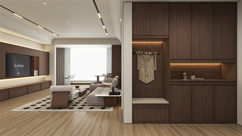 清秋胡桃與骨骼線搭配設(shè)計,從入戶起就開始鋪墊復(fù)古的基調(diào)。中間鏤空、換鞋凳的設(shè)計,讓鞋柜實用性與裝飾性兼?zhèn)洌_放區(qū)集掛、坐、置三重功能于一體。