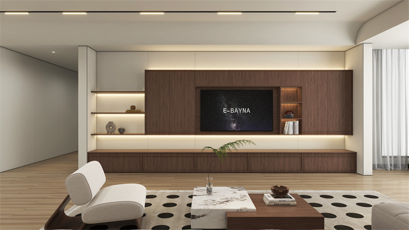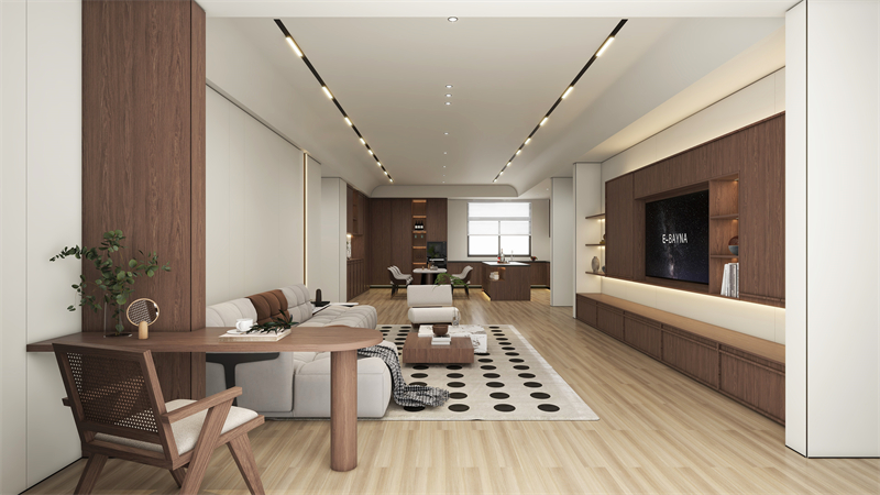 滿墻電視柜+懸空設(shè)計,將收納做到隱形的同時,也展現(xiàn)出了中古風(fēng)的輕盈溫馨,復(fù)古色胡桃木的加入,讓中古氣息越發(fā)濃郁。