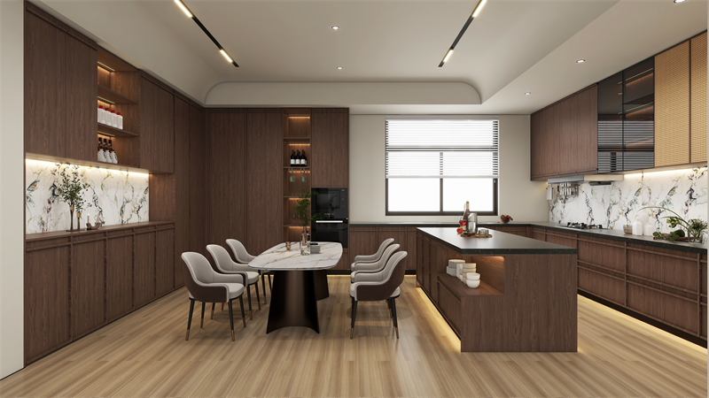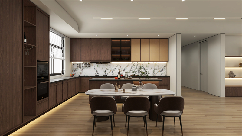 餐邊柜和櫥柜一體化設(shè)計,石紋背板嵌入,更顯高級感,同色同奢定制,弱化了餐廳與廚房過渡的生硬感。
