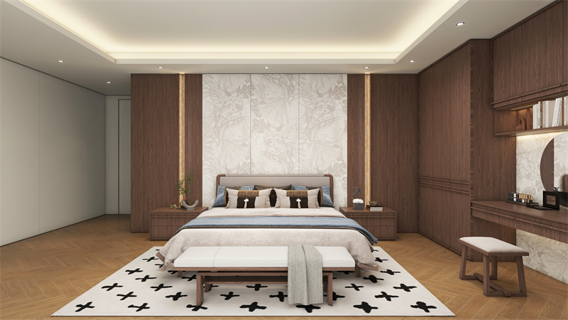 床頭背景墻清秋胡桃護(hù)墻板與藤編元素彼此呼應(yīng),立體質(zhì)感的格柵板加持,將中古風(fēng)的復(fù)古與雅致演繹得恰如其分。