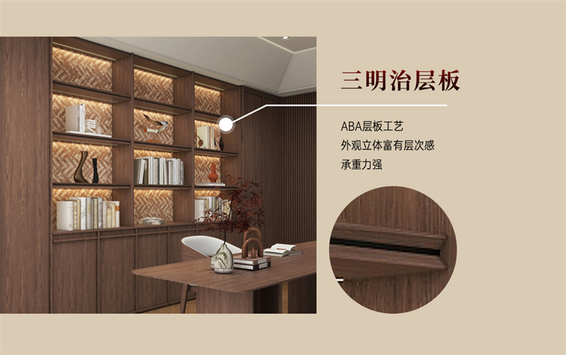 書柜采用三明治層板,外觀立體,富有視覺層次感且承重力強(qiáng)。木紋擁有歲月和自然的痕跡,為空間增添懷舊感,讓書房散發(fā)獨特的氣質(zhì)。