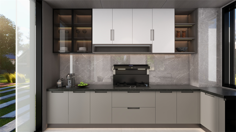 吊柜和地柜分別搭配“晨露白”和“薄暮灰”,中間輔以大理石紋,暖意徜徉,煙火氣撲面而來。整體視覺干凈大氣,玻璃門點綴,增強視覺通透感與層次感。