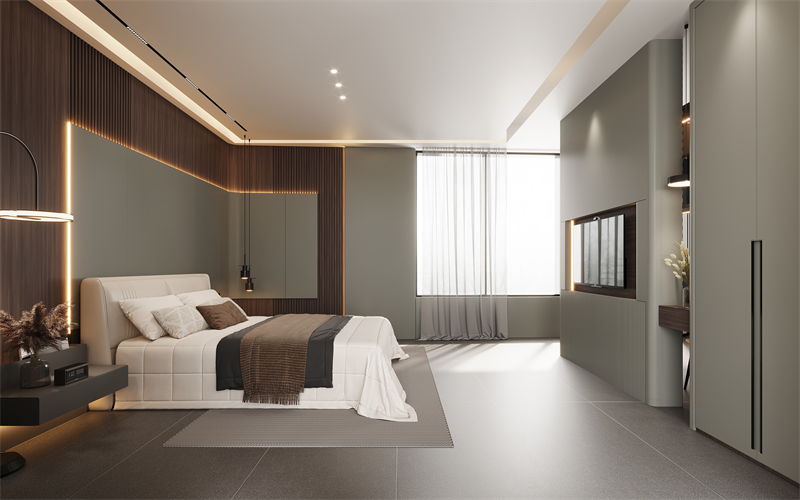 【睡眠區(qū)】床頭護墻板,一前一后采用溫暖的深木色搭配溫婉的“薄暮灰”,護墻板轉(zhuǎn)角采用圓弧過渡,優(yōu)雅流暢的曲線輪廓,彰顯空間的圓潤感、高級感和立體感。柔軟舒適的寢具,讓每個追夢人沉浸美夢之中。