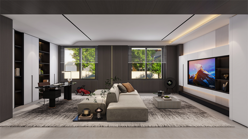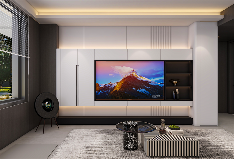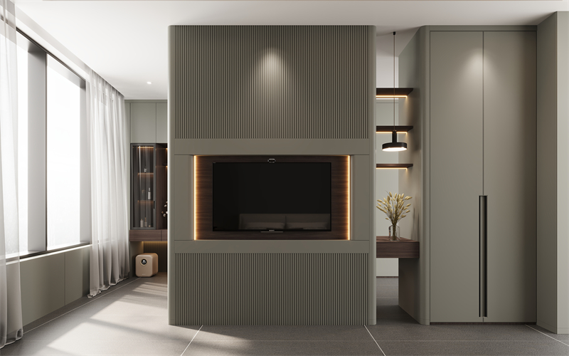 電視背景墻采用簡潔流暢的線條,與簡約的“晨露白”色彩完美融合,弧形轉(zhuǎn)角過渡,展現(xiàn)一種簡約而不失精致的柔美感。電視柜采用高端定制精湛工藝,包括黑科技的懸浮設計+柜中柜設計+拉米諾/無孔工藝,打破傳統(tǒng)墻面的厚重感,賦予空間輕盈靈動的觀感。