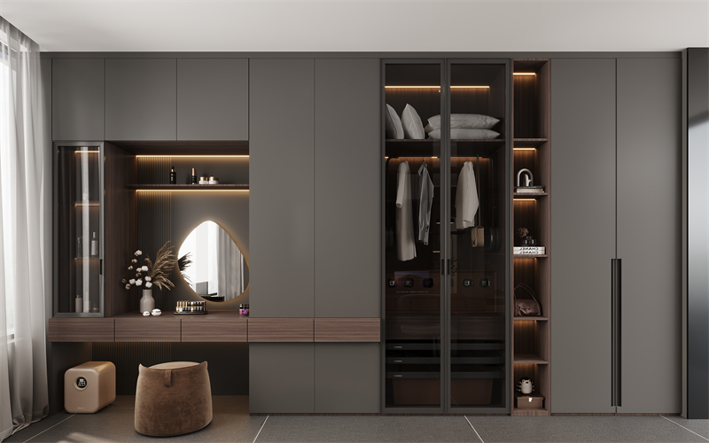 【收納區(qū)】臥室收納區(qū)設置成一個步入式衣帽間,靠墻定制一整排衣柜+梳妝臺,讓每一次的換裝都賞心悅目,為白領精英的美好形象加分,打造高顏值的精致生活。