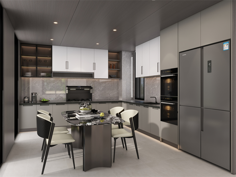 餐廚一體化設計,破除空間壁壘,打造通透自由家。L型廚房布局,科學分區(qū),下廚井然有序。柜電一體化設計視覺統(tǒng)一協(xié)調(diào),還能充分釋放儲物空間。針對廚房潮濕高溫的特殊環(huán)境,櫥柜采用22mm靜電噴粉門板定制柜,360°環(huán)繞防潮覆蓋,耐黃不變色,樹脂粉末高溫固化,色彩更耐看,打造簡約高級的廚房。