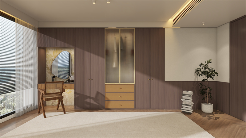 整個(gè)空間以深色木紋打底,大面積的木紋拼框柜門,既保留中古經(jīng)典特色,也兼?zhèn)涔诺渑c現(xiàn)代美感。衣柜局部應(yīng)用長虹玻璃,嵌入梳妝臺,搭配內(nèi)嵌燈帶,透光不投影的朦朧感,驚艷每一天。