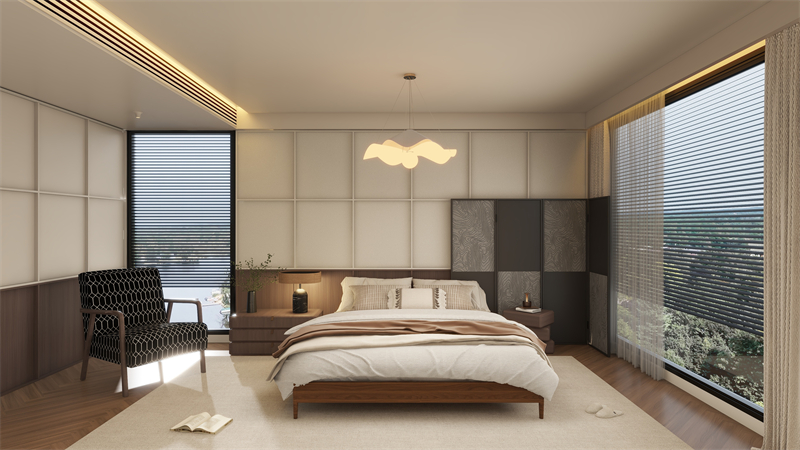 溫潤柔和的臥室空間,捕捉記憶與情感的詩意,陳述著過去與未來的情愫。床頭背景墻采用凹凸有致、細(xì)膩流暢的骨骼線與拼色護(hù)墻板,讓空間呈現(xiàn)多維立體的藝術(shù)美。落地窗讓陽光灑進(jìn)來,整個(gè)空間都亮了起來,感覺走進(jìn)了溫暖的夢境。
