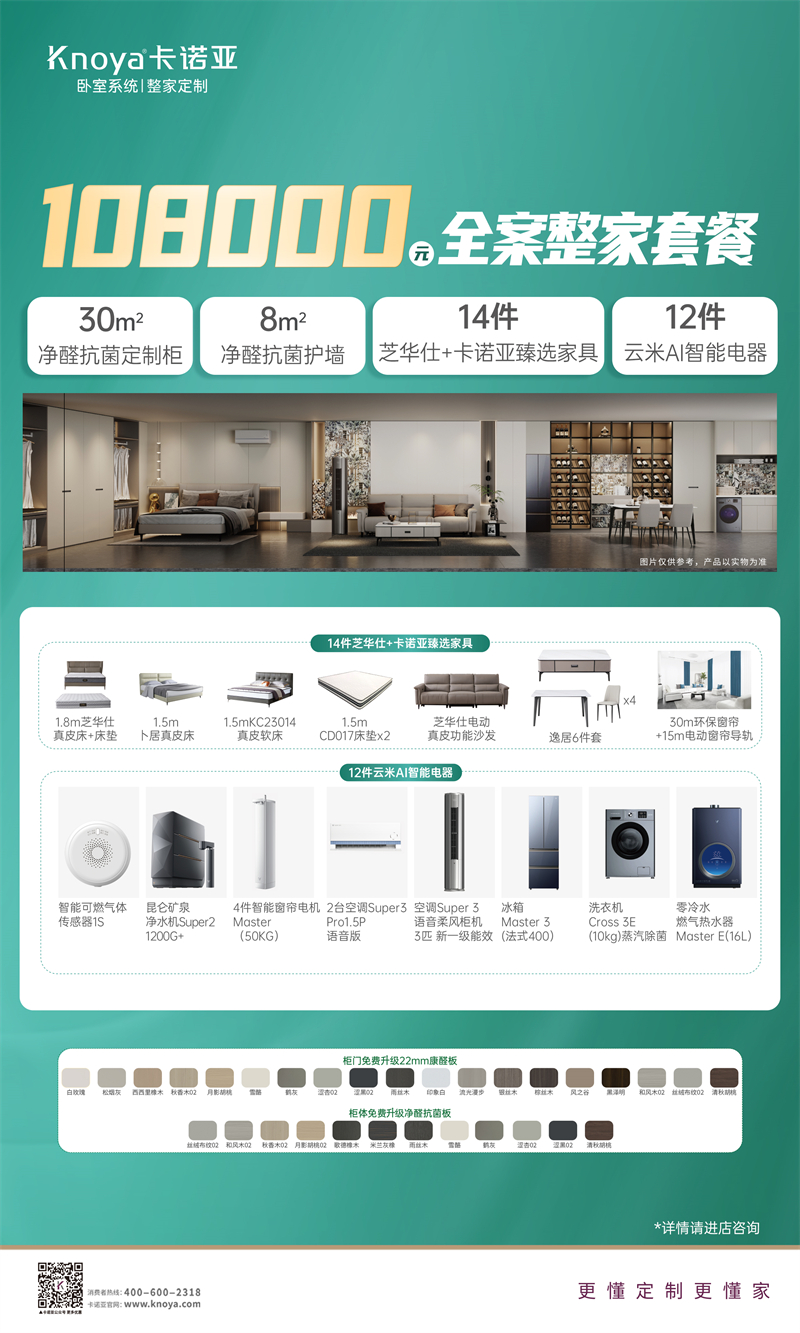 卡諾亞此次315活動,攜手多個高端品牌如芝華仕、CBD、云米科技等,為消費者提供一站式的家居解決方案。活動期間,卡諾亞除了以上2大套餐,還精心推出32800元忙在臥室套餐、28800元享在臥室套餐、24800元學在臥室套餐等,涵蓋臥室系統(tǒng)+整家定制兩大品類,包括定制柜、護墻板、全屋家具以及智能家電,聯(lián)手更多大牌,真正實現(xiàn)“整家定制更高配,全屋家具更滿配,智能家電更全配”的理念。