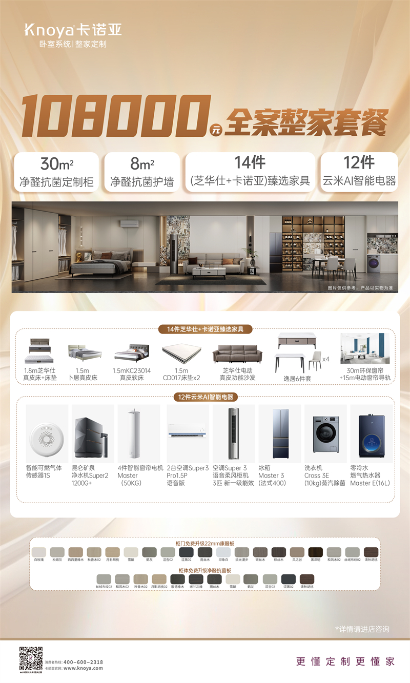 本次活動,卡諾亞還特別推出32800元忙在臥室套餐、28800元享在臥室套餐、24800元學在臥室套餐等,涵蓋臥室系統+整家定制2大品類,包含定制柜、護墻板、全屋家具及智能家電,同時攜手芝華仕、CBD、云米科技等多個高端品牌,致力于為消費者打造舒適、便捷且極具品質感的理想臥室空間。