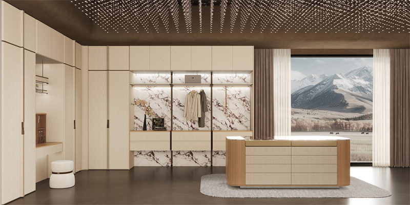 ·智能功能賦能:電動升降煙機、吊柜電動升降機等智能配件,實現(xiàn)隱現(xiàn)自如的功能美學(xué);立柱衣帽間系統(tǒng)自帶燈光,搭配西班牙蘭伯特收納五金,奢享收納儀式感。