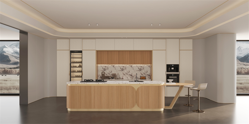·原創(chuàng)設(shè)計語言:源自鉆戒輪廓的門型,以戒指拉伸開的獨特輪廓融入門型設(shè)計,以左右圓弧+上下裝飾線勾勒立體層次,搭配鋅合金拉手,是功能與藝術(shù)、創(chuàng)新的完美融合;游艇造型中島臺與花瓣門板的組合,將豪華游艇的美學(xué)融入廚房空間。