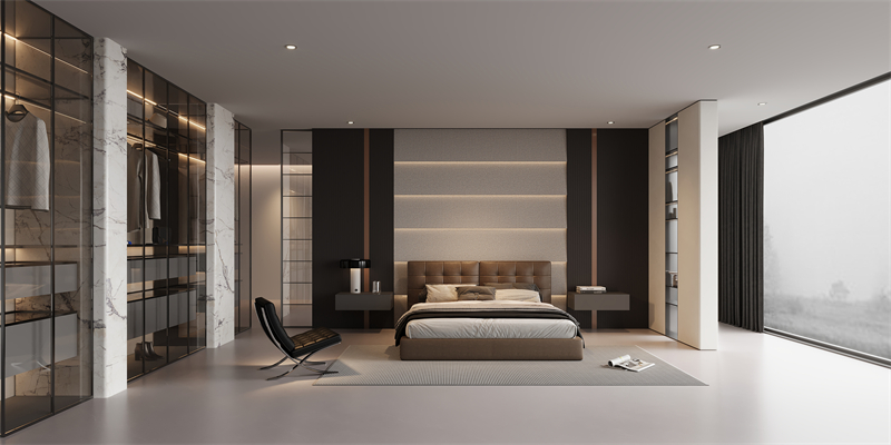 ·材質(zhì)對話:直紋肌理板材與澀黑柜體形成深淺對比,數(shù)碼打印出來的紋理如大理石般通透,鋁木玻璃柜將金屬堅韌與木材溫潤完美結(jié)合。