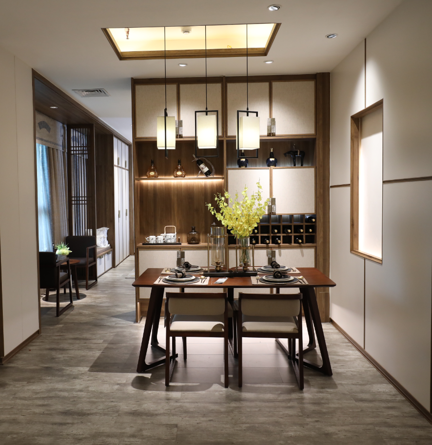 整面墻半開放式酒柜,收納功能強大,既放置名酒,可擺放飾品,提高家居格調,彰顯主人品位。中式傳統回字形的墻面,與天花板遙相呼應。收納強大的柜子可放置餐具碗筷,聲動感應燈,可照亮飾品,為空間增色,讓食欲大增。