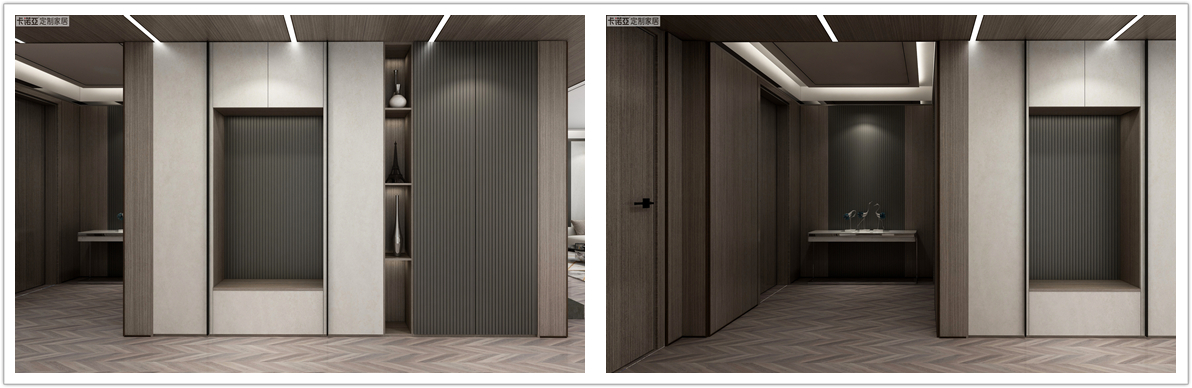 墻面以木紋為基礎,搭配卡諾亞“慕尼黑”凹凸格柵護墻板,豐富了空間的層次感。方正對稱的結構設計,柜體墻面一體化,視覺上整體統(tǒng)一。