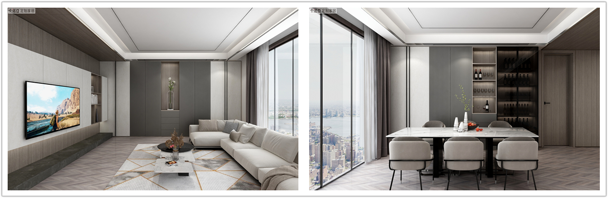 卡諾亞“銀絲木”大面積運用,“慕尼黑”格柵門板作為點綴,搭配米色的沙發(fā)和白色大理石餐桌,整個空間硬朗有張力,凸顯現(xiàn)代都市生活注重快節(jié)奏與簡潔實用。
