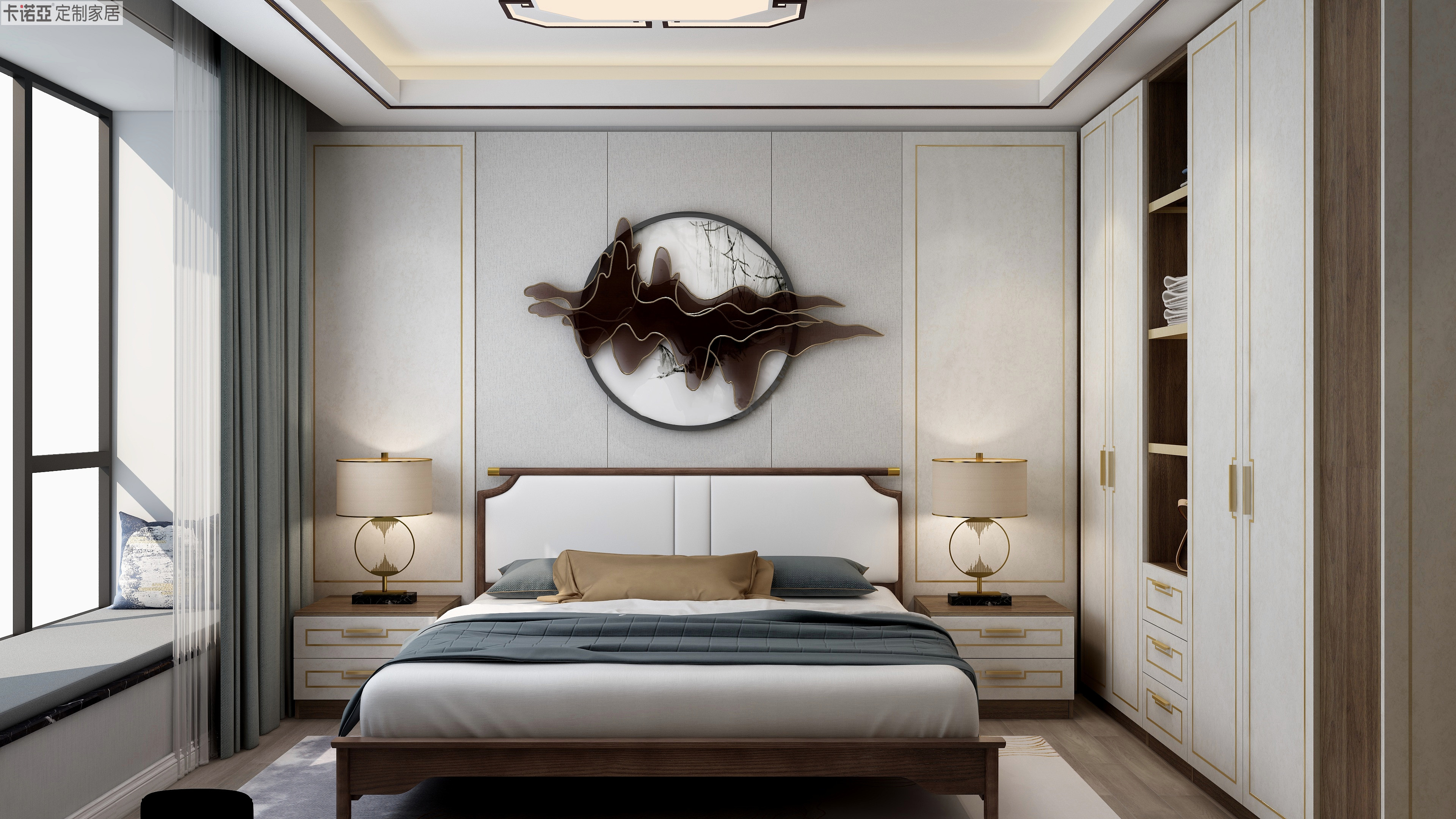 米色成為空間的主色調(diào),輔以木紋材質,自然而舒適,營造良好的睡眠環(huán)境?;丶y型金屬條及黃銅色拉手點綴空間,盡顯新中式風格的輕奢觀感。