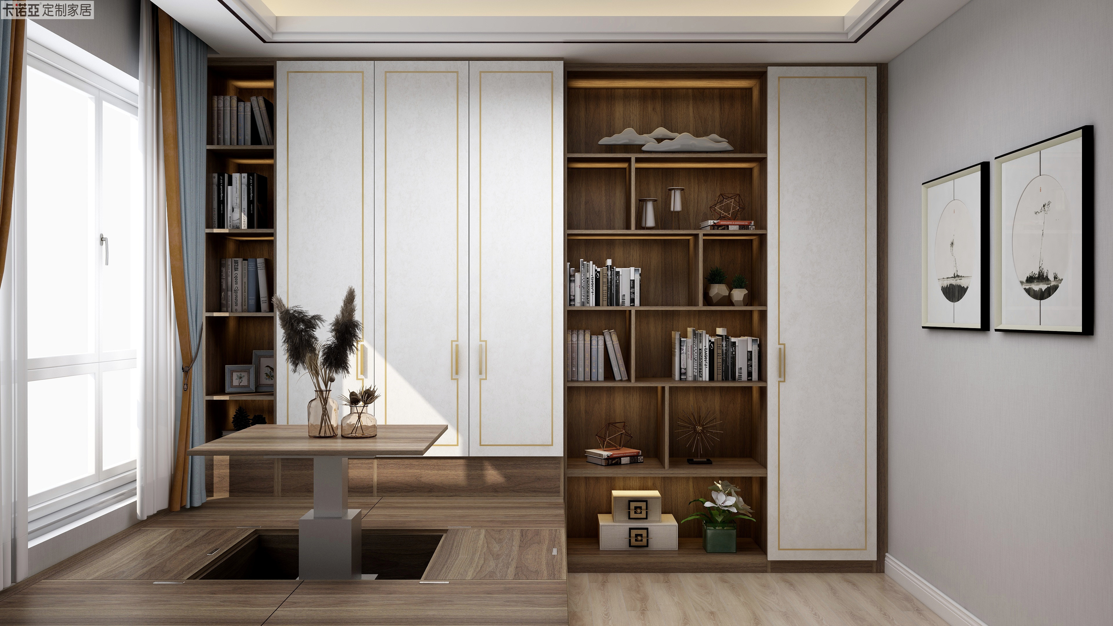 榻榻米是多功能房的不二之選,采用卡諾亞“御品木”的榻榻米,彰顯東方式書房的戀木情結。與榻榻米連為一體的書柜,柜門采用淺色花紋,表面同樣嵌入回紋型金屬條,加上金屬拉手的點睛,讓中式書房寧靜致遠中綻放優(yōu)雅之美。